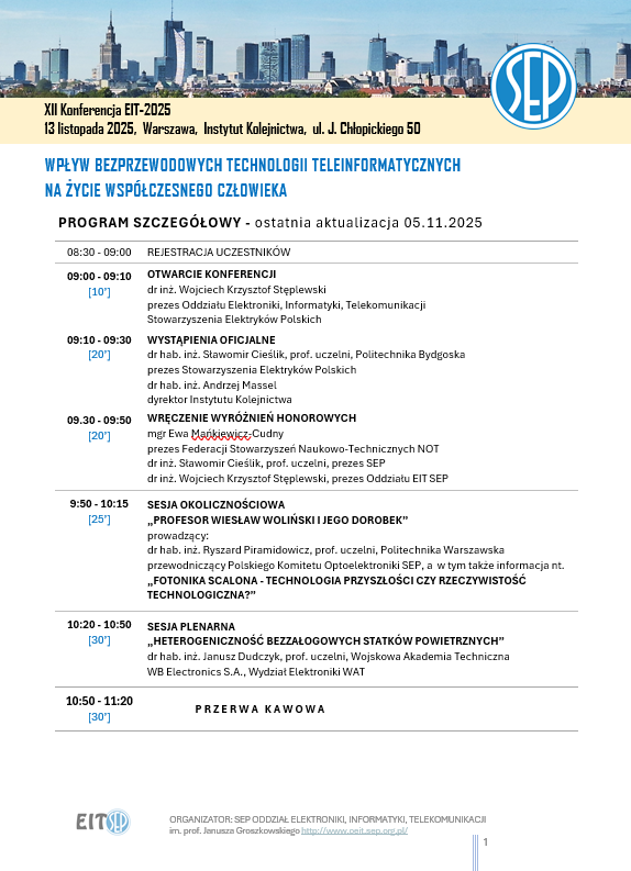 Oddział Elektroniki, Informatyki, Telekomunikacji SEP im. prof. Janusza Groszkowskiego zaprasza na XII KONFERENCJĘ EIT-2025 z cyklu „WPŁYW BEZPRZEWODOWYCH TECHNOLOGII TELEINFORMATYCZNYCH NA ŻYCIE WSPÓŁCZESNEGO CZŁOWIEKA”